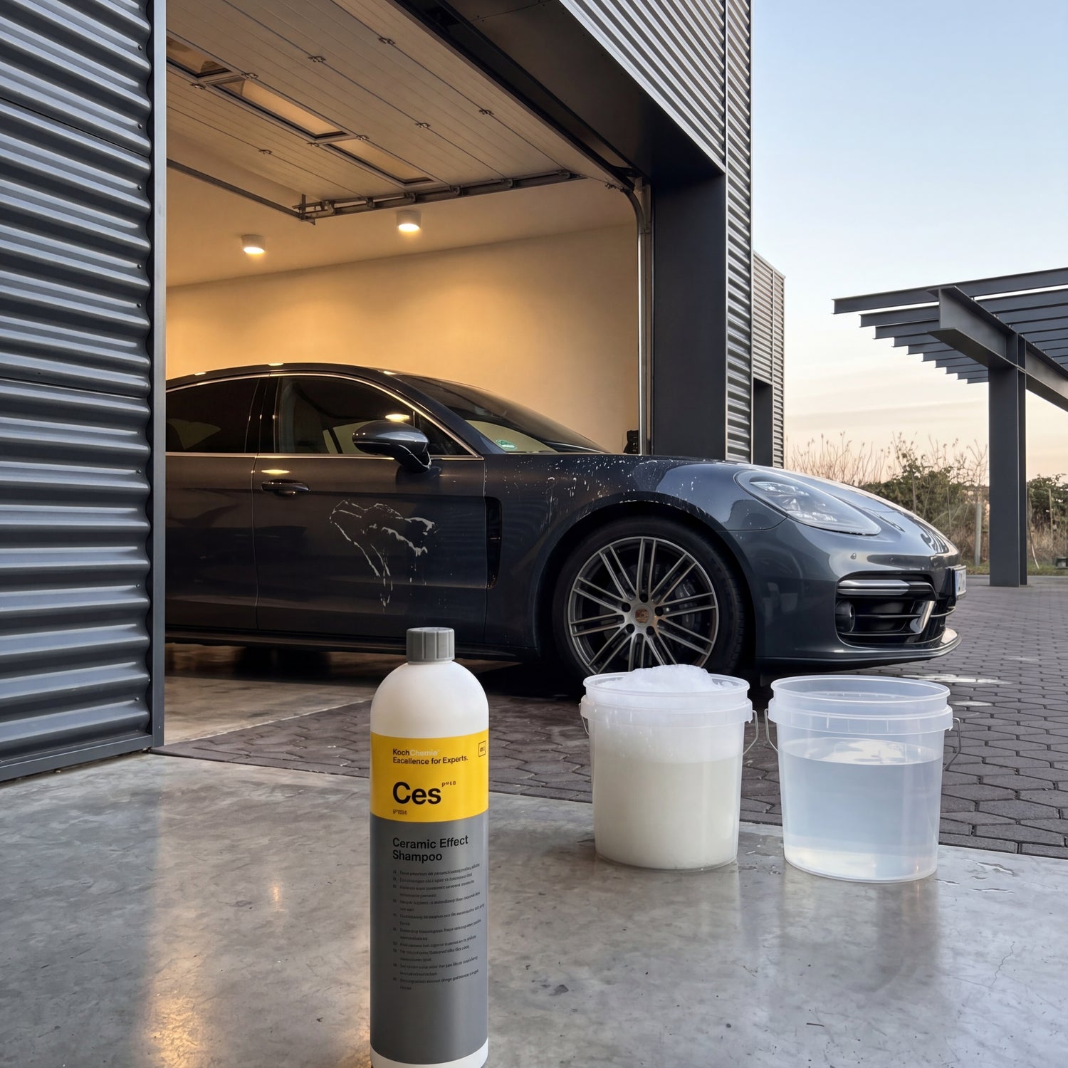 What is Koch-Chemie Ces? A pH 6 care shampoo with SiO₂ component that cleans in one step and leaves a hydrophobic polymer film on paint, glass, and plastic. Not a substitute for a full ceramic coating, but a booster for already coated vehicles.