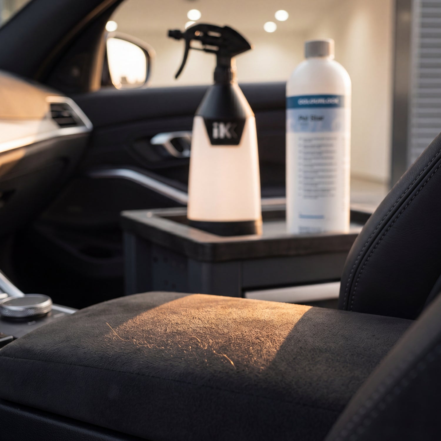 Clean Alcantara seat after COLOURLOCK Pol Star cleaning, iK spray bottle in background