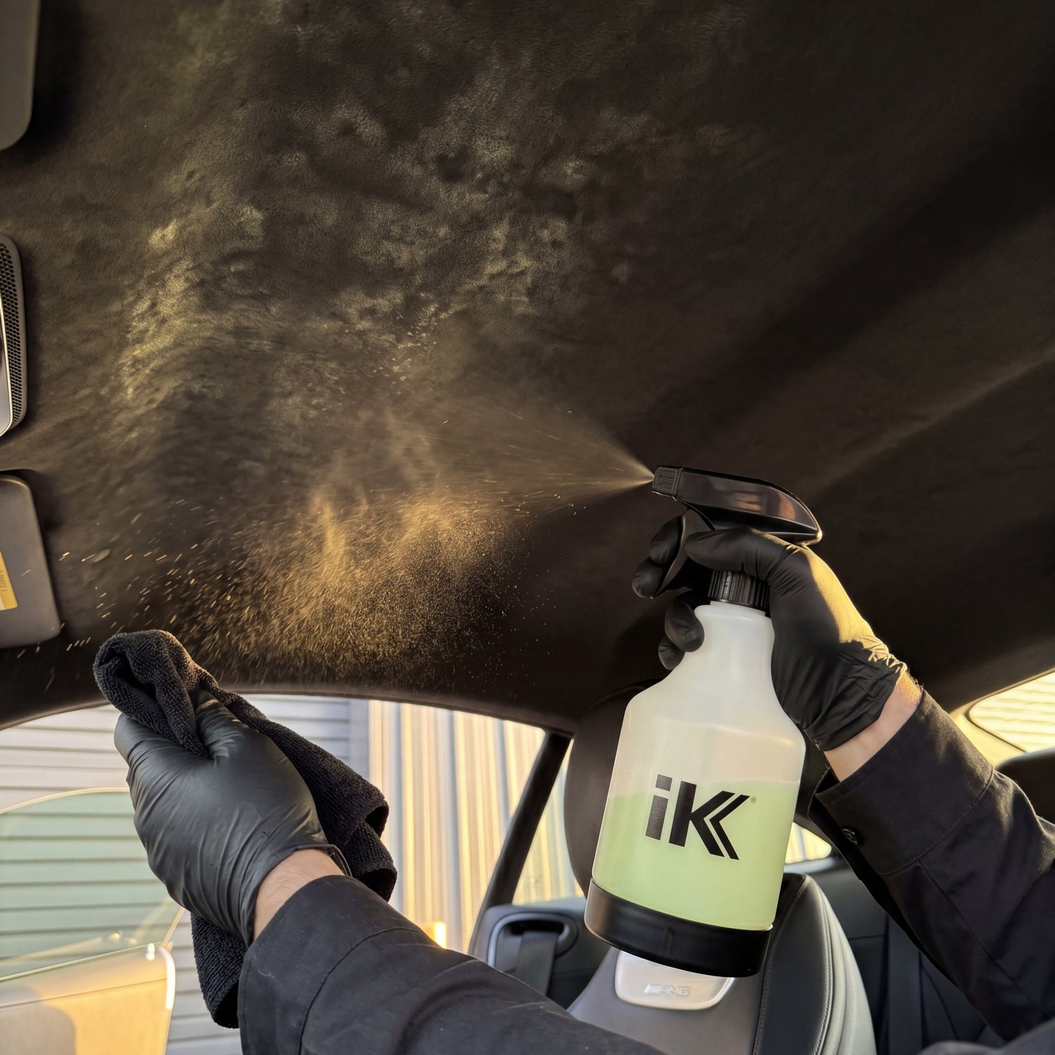 Headliner cleaning with diluted Koch-Chemie Mzr from iK Multi TR 1 spray bottle in a Mercedes-AMG GT