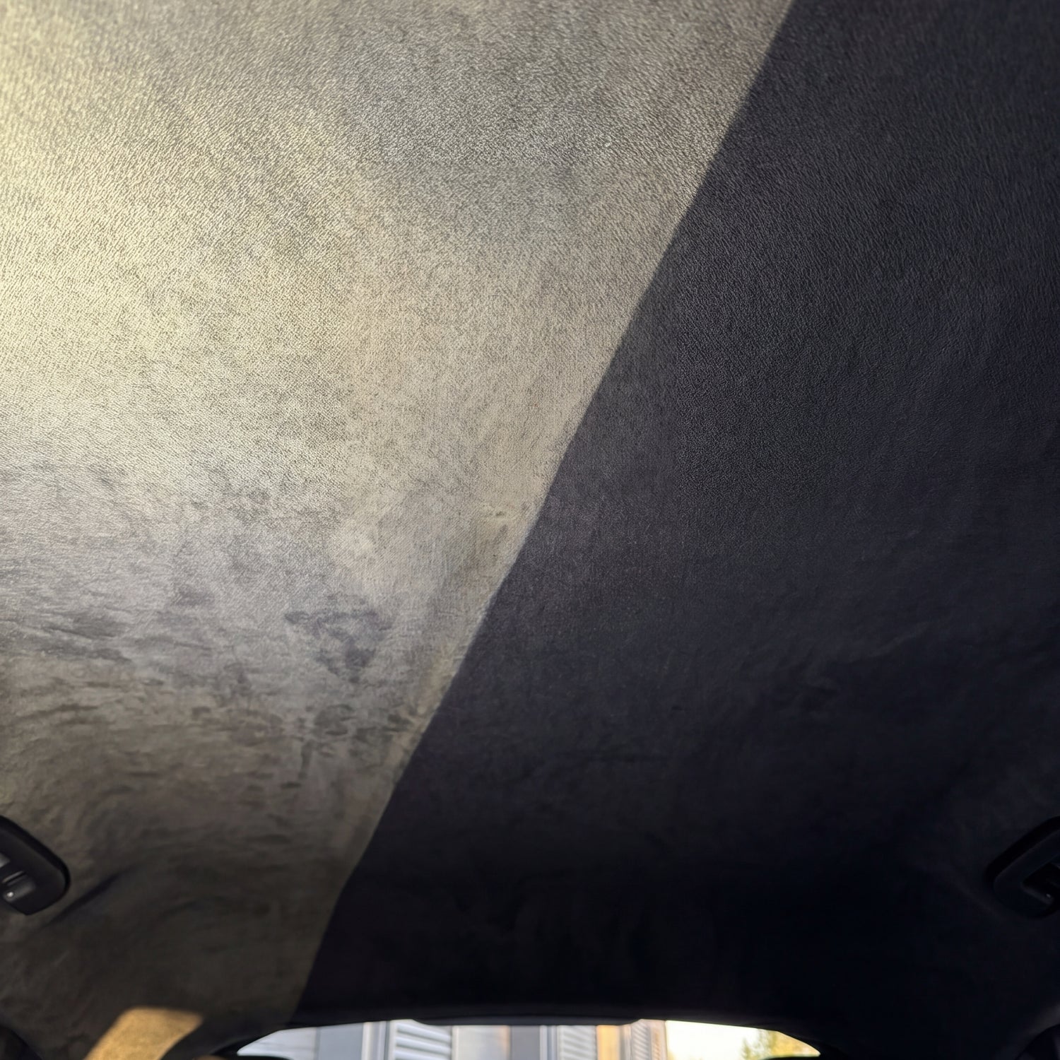Headliner before and after cleaning with Koch-Chemie Mzr – nicotine discoloration on the left, rich black Alcantara on the right