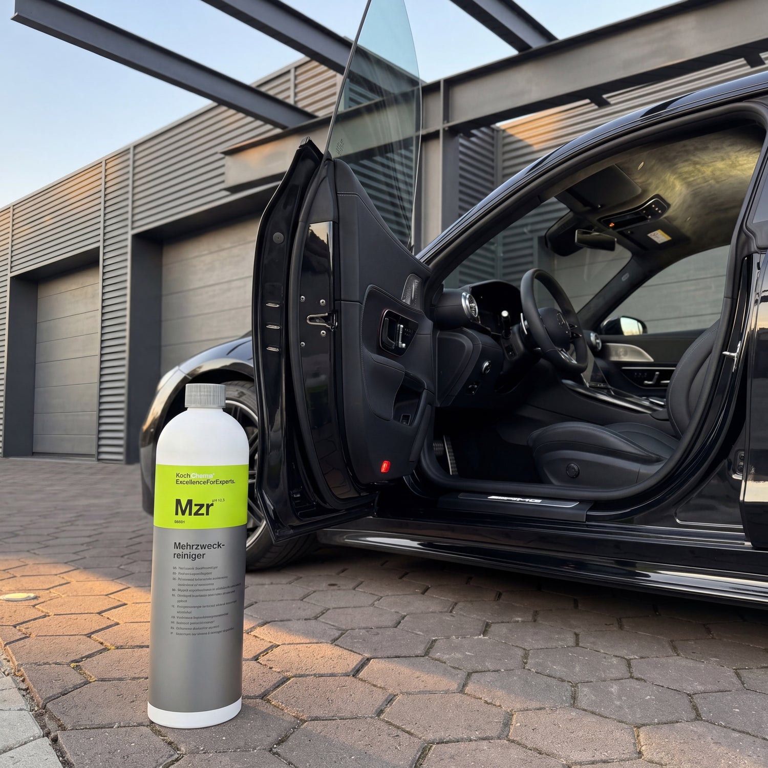 Koch-Chemie Mzr 1L bottle next to open door of a black Mercedes-AMG GT in the warehouse workshop