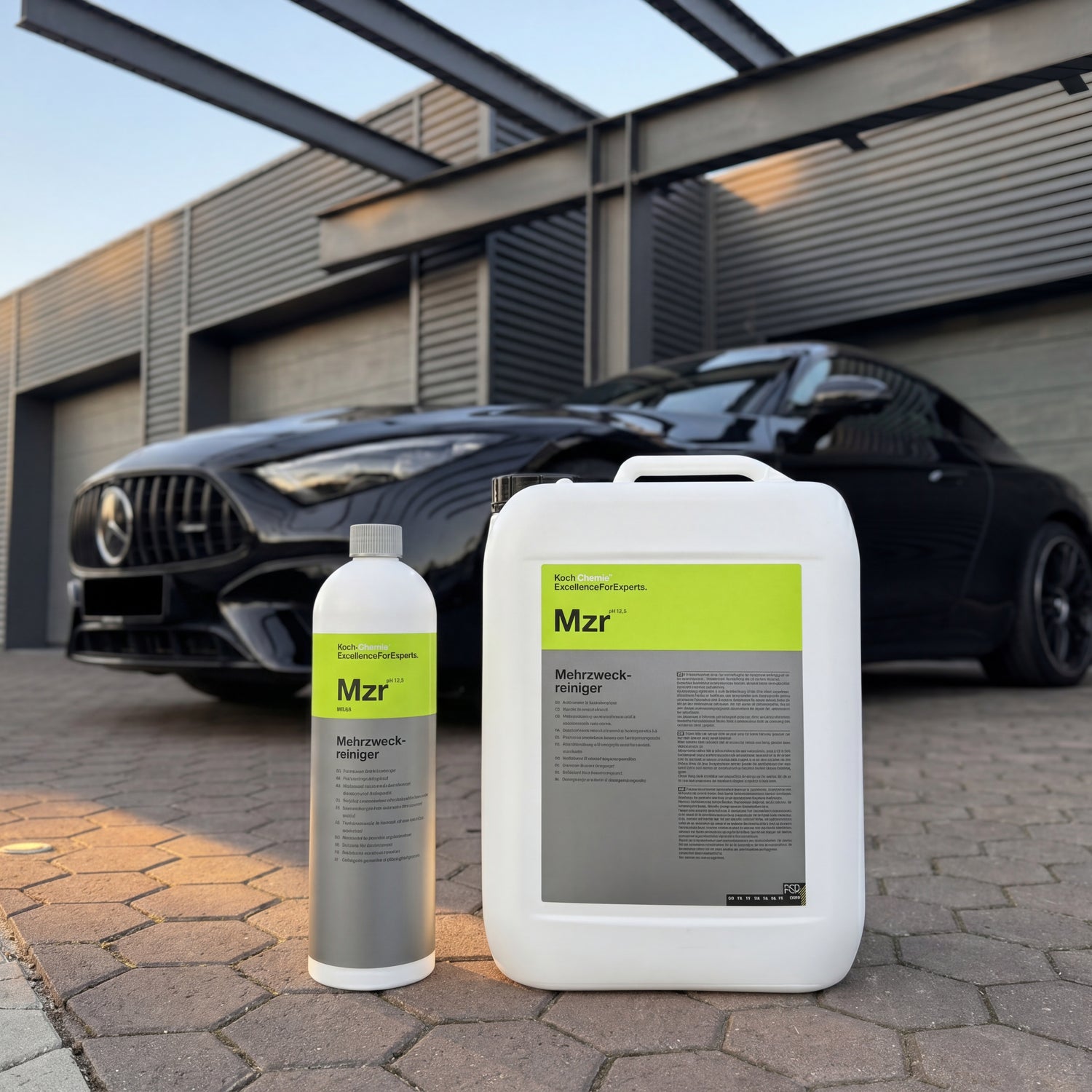 Koch-Chemie Mzr 1 liter bottle and 11 kg canister on paving stones in front of a warehouse with a Mercedes-AMG GT