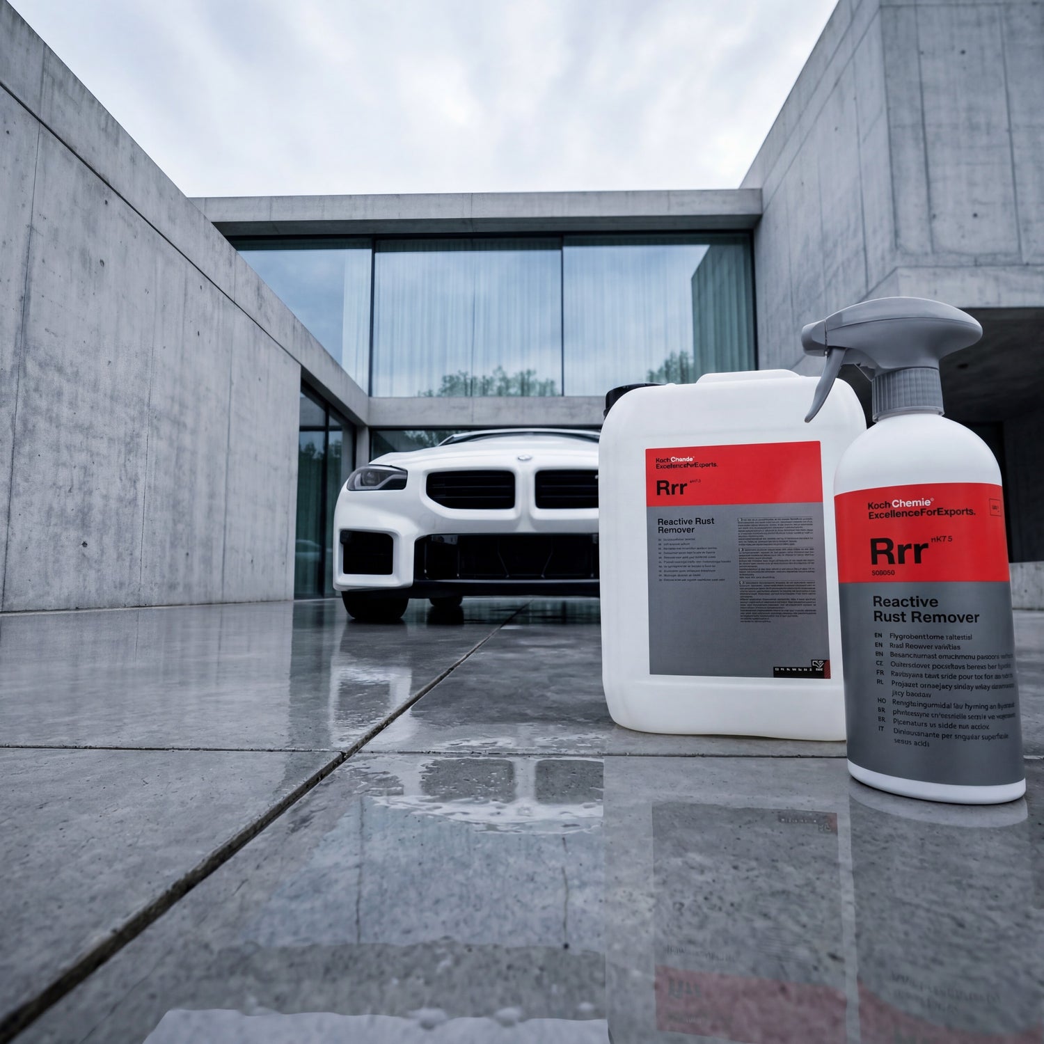 The Reactive Rust Remover "Rrr" from Koch-Chemie is a pH-neutral iron remover based on ammonium mercaptoacetate. It chemically dissolves iron particles from paint, glass, and rims — visibly indicated by a violet color change. At pH 7.5, it is acid-free and gentle on materials, suitable for use on all common surfaces.