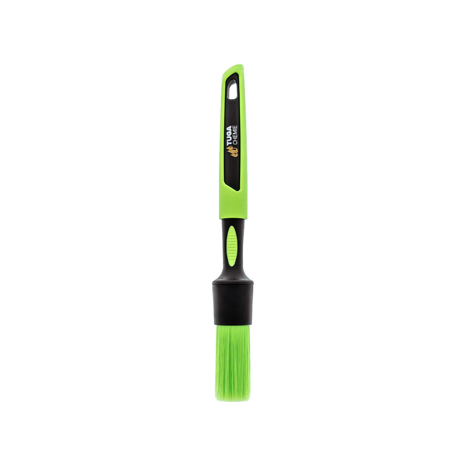The Detailing Wheel Brush from TUGA Chemie is the precision tool in the wheel cleaning workflow. The green plastic handle with black silicone soft grip fits comfortably in the hand, and the black plastic ferrule connects the handle and bristles without metal parts — no point in the brush where acid or alkali could corrode. The green synthetic bristles are chemically resistant to pH values from 0 to 14 and at the same time soft enough to work directly on painted wheel surfaces, polished aluminum edges, and brushed stainless steel without leaving holograms or micro-scratches. This is the difference from cheap hardware store brushes with metal ferrules and hard nylon bristles, which rust after the third contact with a wheel cleaner and grind scratches into the paint.