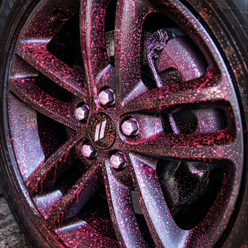 Warum verfärbt sich der Reiniger violett? Das ist die Reaktion mit eisenhaltigem Bremsstaub. Der Farbumschlag zeigt an, dass der Schmutz aktiv gelöst wird.