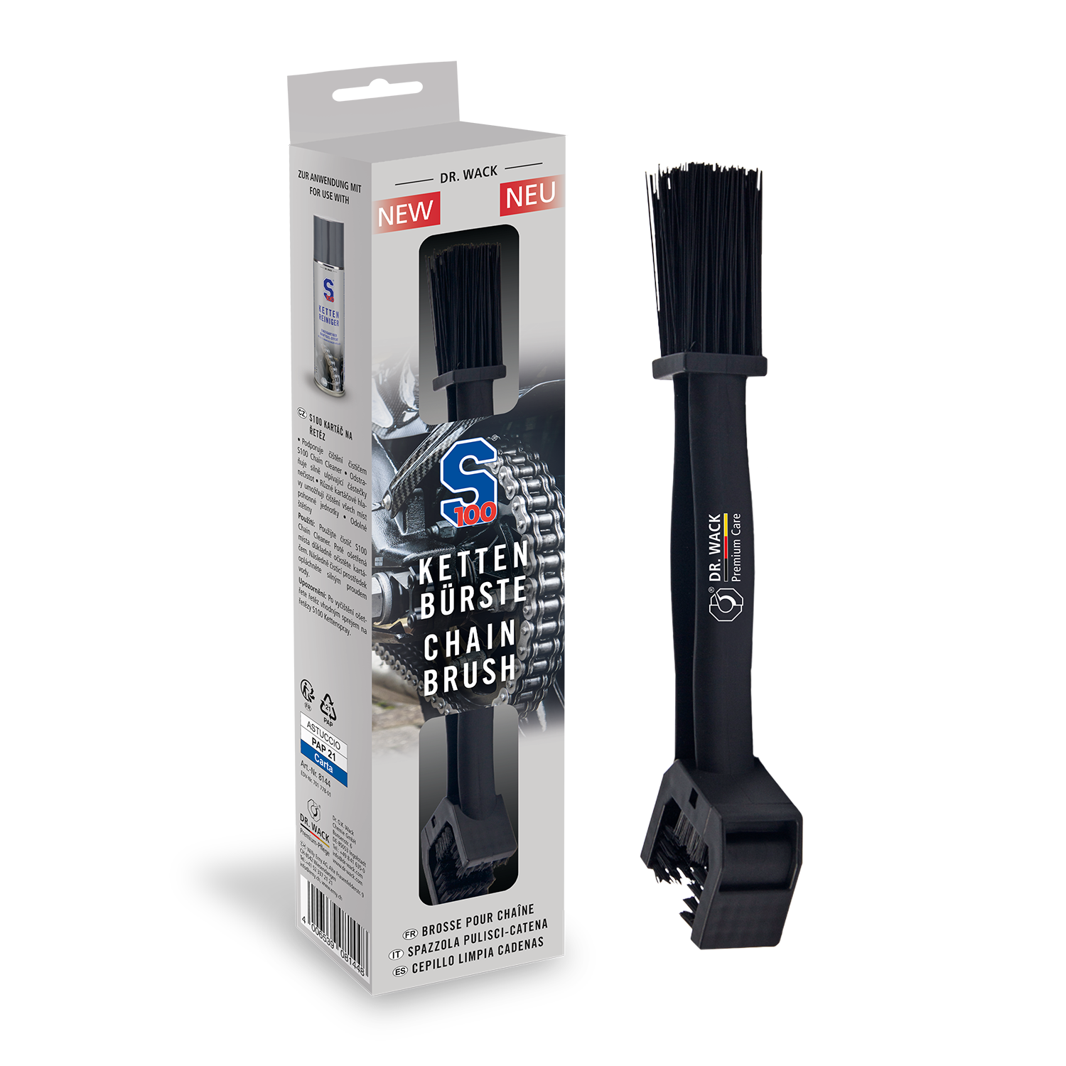 Die Dr. Wack "S100" Kettenbürste ist die ideale Ergänzung zur Anwendung des S100 Kettenreinigers (Gel-Formel mit hoher Kriechfähigkeit) und einem anschließenden Kettenspray wie S100 Weißes Kettenspray 2.0 oder Dry Lube. So verwandelst du deine Pflege-Routine in einen effizienten, schmierfähigen Rundum-Service für deinen Antrieb.