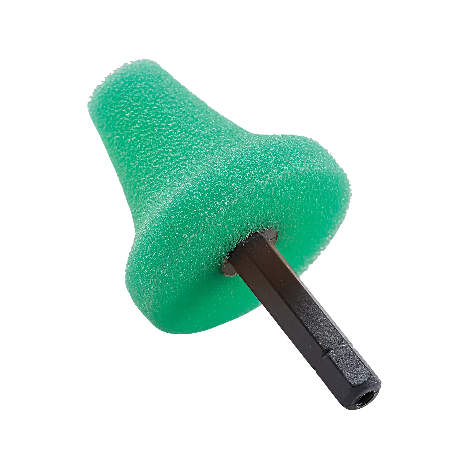 Der Polier-Kegel ist das Präzisionswerkzeug im FS 140 System. Während der Zylinder großflächig rollt, dringt die Kegelspitze in Vertiefungen ein, folgt Kurven und erreicht Winkel, die selbst mit dem besten Handapplikator schwer zugänglich sind. Die Exzenterbewegung der FS 140 kombiniert mit der konischen Geometrie erzeugt eine dreidimensionale Arbeitsbewegung, die Pflegeprodukte auch in engen Karosserie- und Polsterstrukturen tief und gleichmäßig einarbeitet.