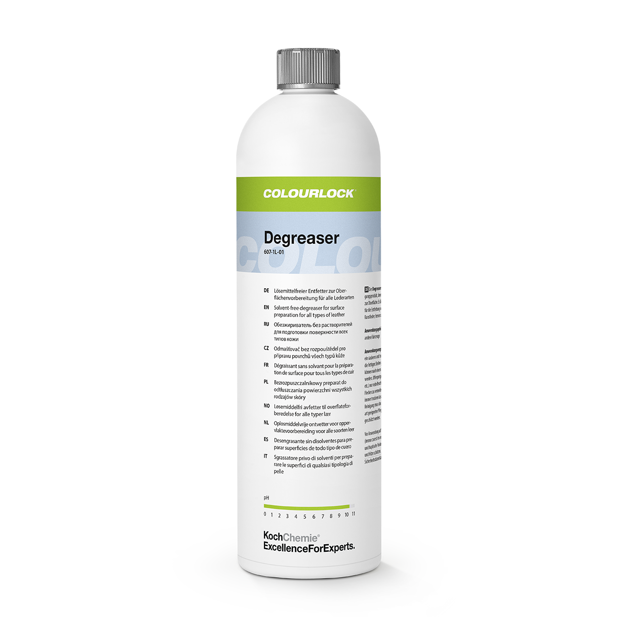 COLOURLOCK Degreaser ist ein effektiver, lösemittelfreier Entfetter zur Vorbereitung von Leder und Kunstleder vor Reparaturen, Farbauffrischungen oder Versiegelungen. Er entfernt zuverlässig Hautfette, Schmutzfilme, Pflegeproduktreste und leichte Ölspuren – besonders an stark berührten Bereichen wie Sitzwangen, Lenkrädern, Armlehnen, Möbelkanten, Taschen oder Griffzonen. Die Formulierung ist kraftvoll, aber schonend und eignet sich auch für empfindlichere Lederoberflächen, ohne das Material auszutrocknen oder zu schädigen.