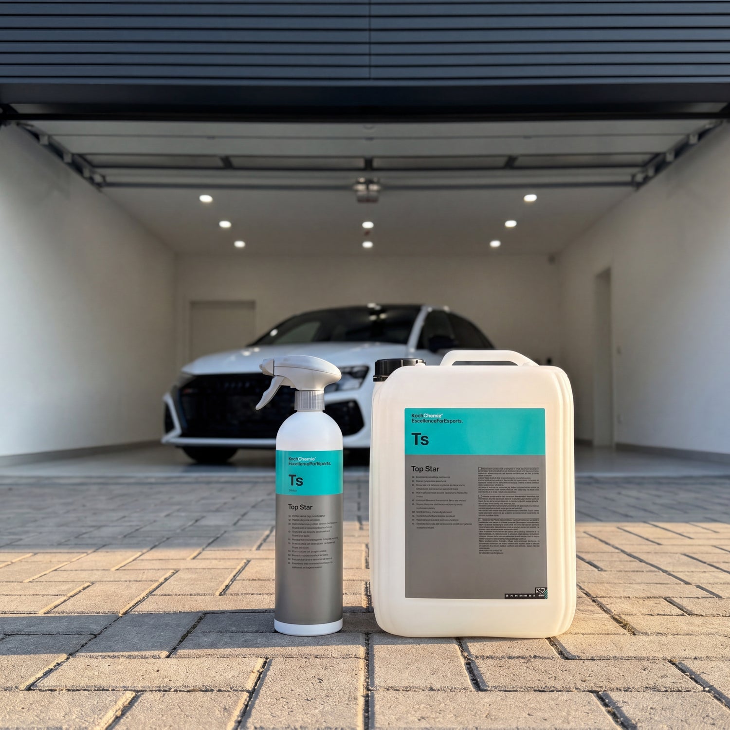 Was ist der Koch-Chemie Top Star "Ts"? Eine silikonölfreie Premium-Pflegeemulsion für Kunststoff- und Gummiteile im Fahrzeuginnenraum, die einen seidenmatten Schutzfilm mit UV-Schutz und antistatischer Wirkung hinterlässt. Kein Reiniger, kein Hochglanz-Dressing und nicht für Lenkrad oder Pedale geeignet.